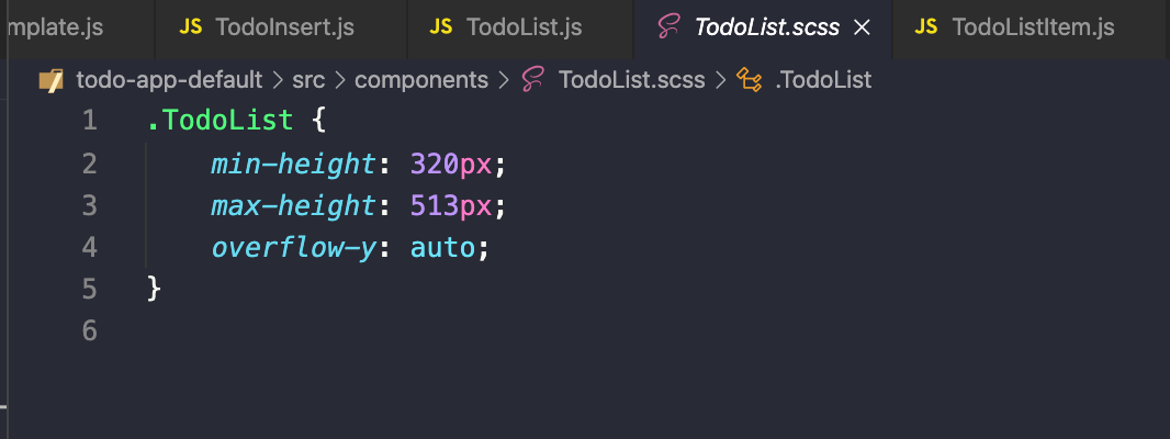 4. TodoList: todos라는 배열을 props로 받아온 후, 이를 배열 내장 함수 map을 사용하여 TodoListItem 컴포넌트로 변환하여 보여주는 컴포넌트