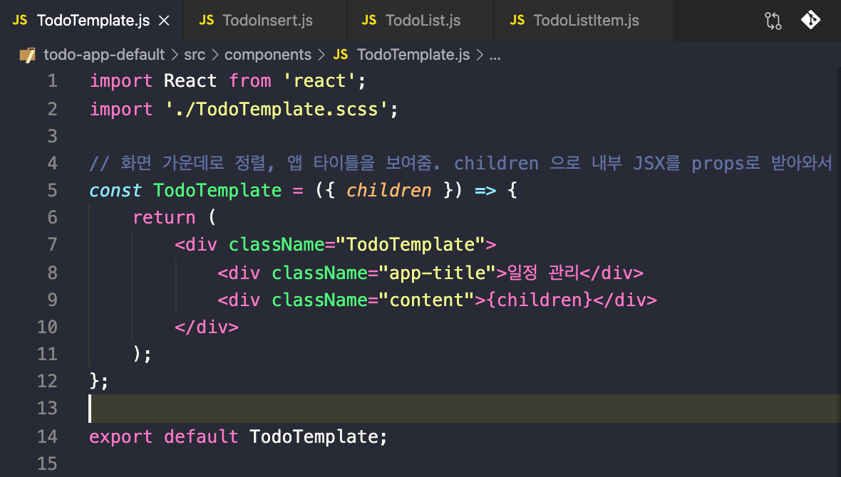 TodoTemplate은 전체 div의 전체적인 위치를 잡아주는 역할 + App.js에서 children으로 들어오는 Component들을 내부 div에 배치시켜주는 역할을 합니다. 예제에서는 div.content에 {children} 으로 컴포넌트를 받고 있습니다.