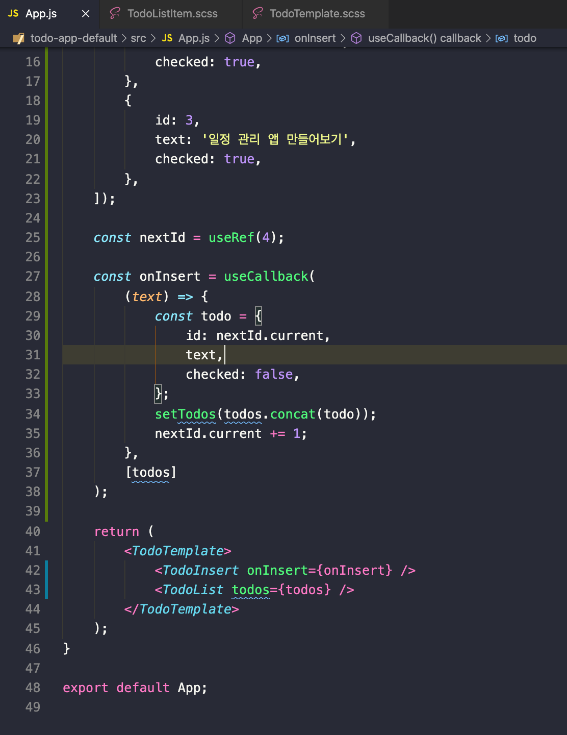 이제 만들어진 onInsert() 함수를 항목 추가버튼이 있는 컴포턴트인 TodoInsert 의 props로 전달합니다.