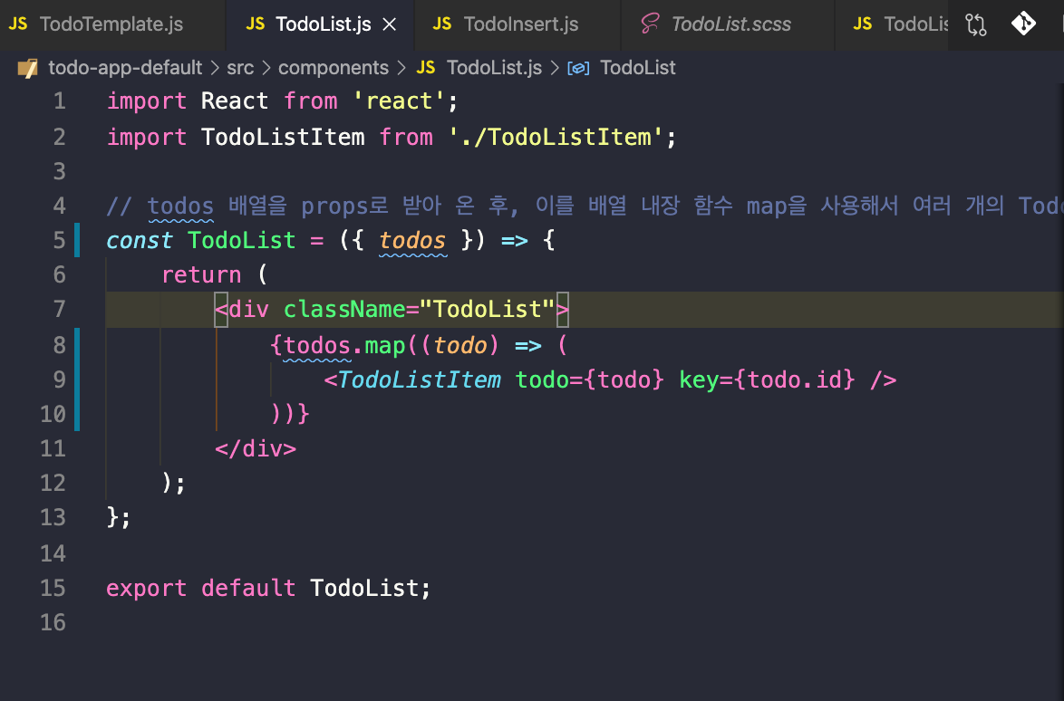 props로 받아 온 todos 배열을 배열 내장 함수 maps을 통해 TodoListItem으로 이루어진 배열로 변환하여 랜더링해 주었습니다. map을 이용하여 컴포넌트로 변환할 때는 key props를 전달해 주어야 하는데 이때 각 todo 객체의 고윳값이 id를 전달해줍니다. 그리고 TodoItem에서 다룰 데이터는 통째로 props 로 전달하면 됩니다.