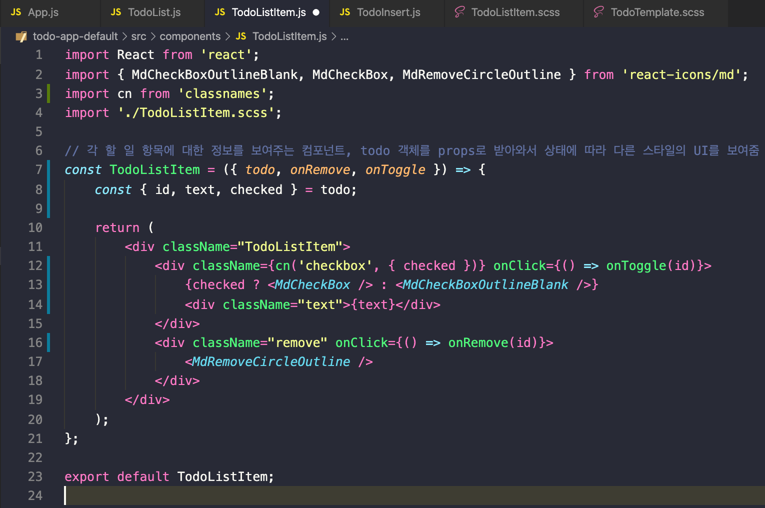 아무튼 <TodoListItem todo={todo} key={todo.id} /> 형식으로 JSX 구문이 생성되었으므로 todo 값에 따라 적절한 UI를 보여줄 수 있도록 컴포넌트를 수정해보겠습니다.