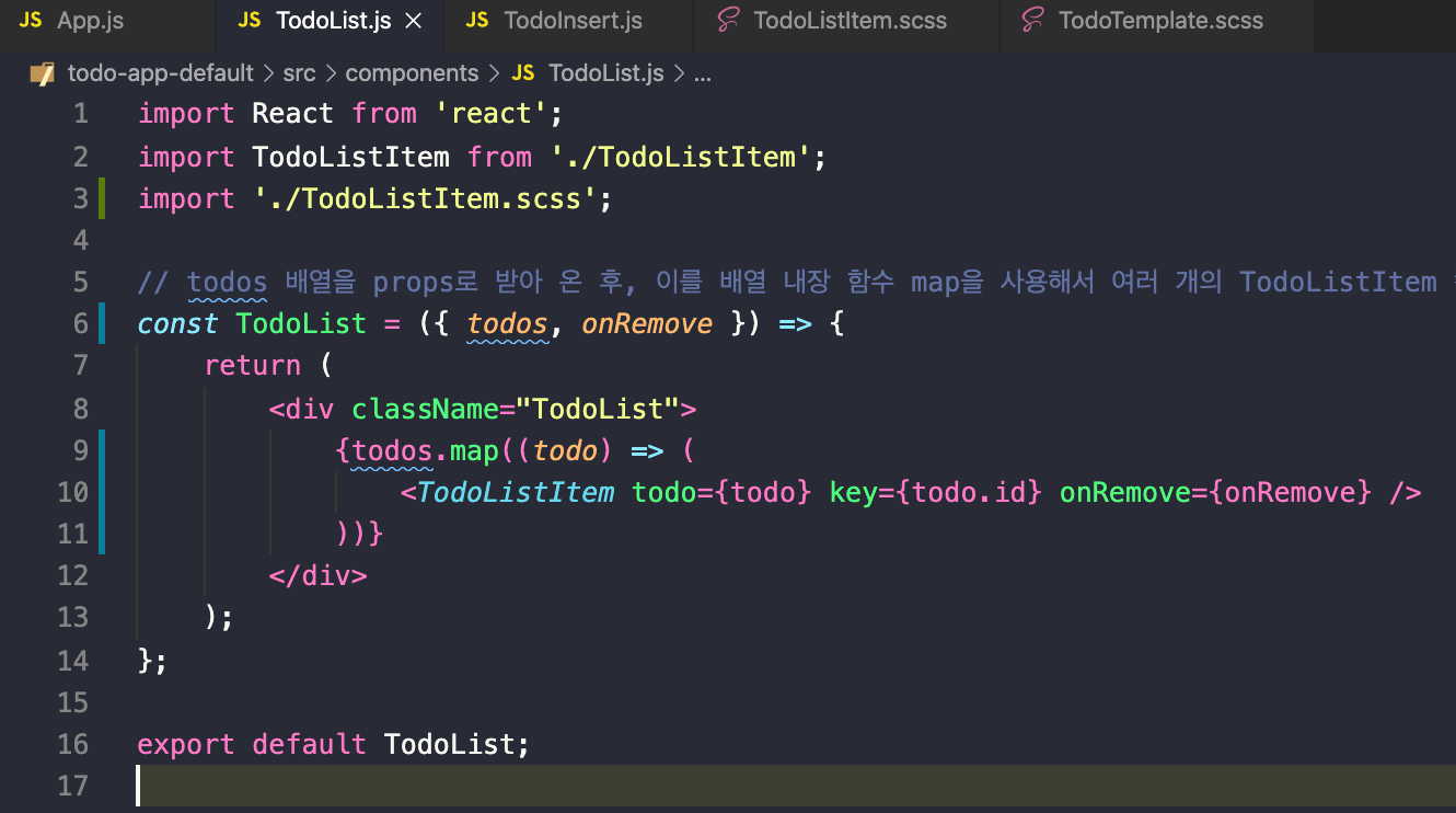 todos 배열 안에 들어있는 객체에는 각 항목의 Id, 내용, 완료 여부를 알려주는 값이 포함되어 있습니다. 이 배열은 TodoList에 props에 전달됩니다. TodoList에서 이 값을 받아온 후, TodoItem으로 변환하여 랜더링 하도록 설정할 것입니다.