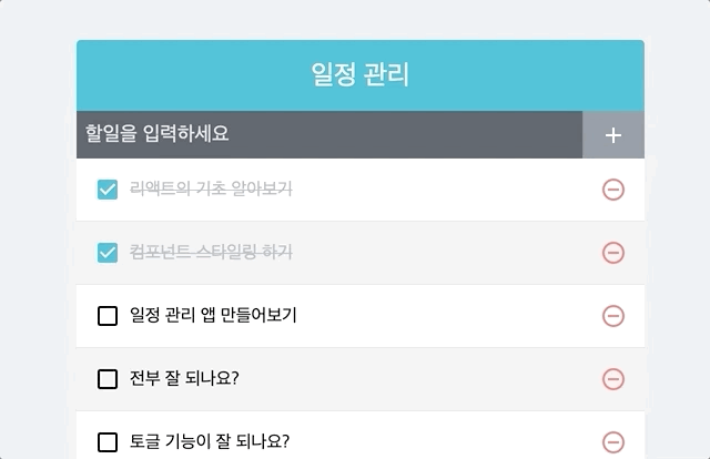 토글기능도 삭제 기능과 꽤 비슷합니다. App에서 수정 함수를 만들어서 TodoList에게 전달하고 이것을 TodoListItem 의 props으로 넣어주면 됩니다.