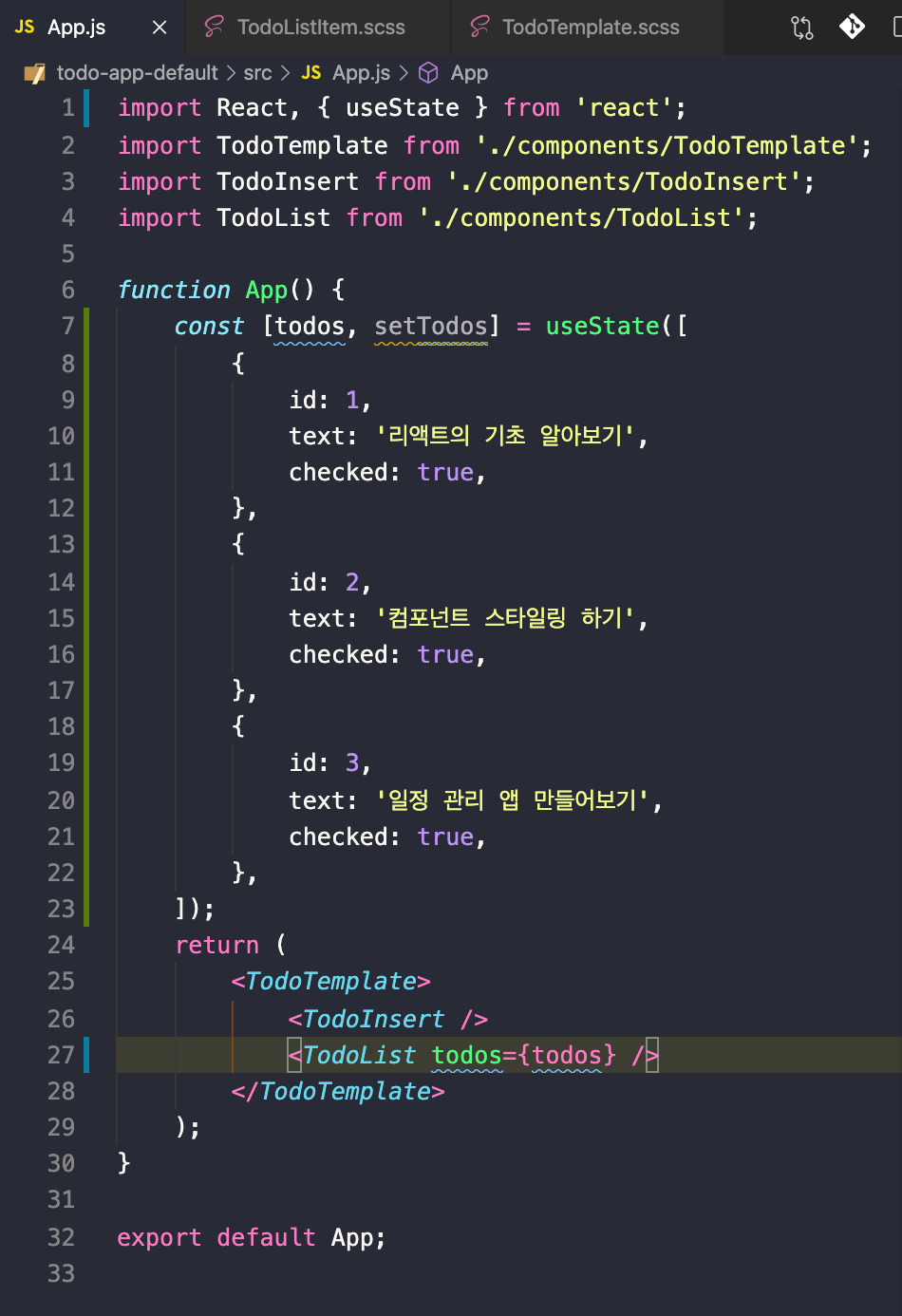 나중에 추가할 일정 항목에 대한 상태들은 모두 App 컴포넌트에서 관리합니다. App에서 useState를 사용하여 todos라는 상태를 정의하고, todos를 TodoList의 prop으로 전달합니다.