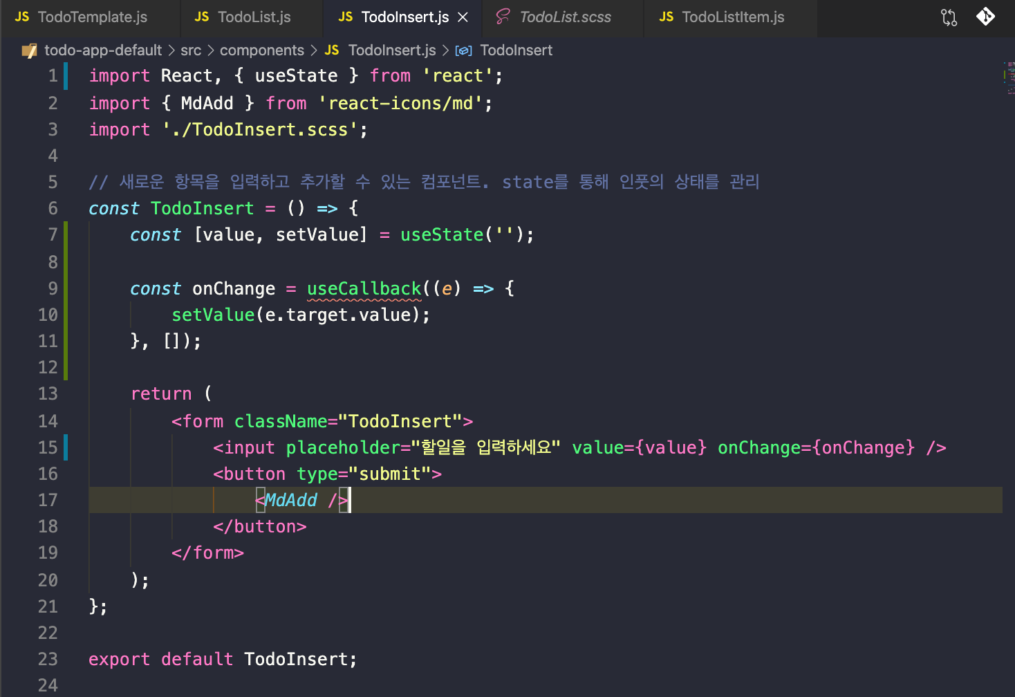 먼저 TodoInsert 컴포넌트부터 수정하겠습니다.