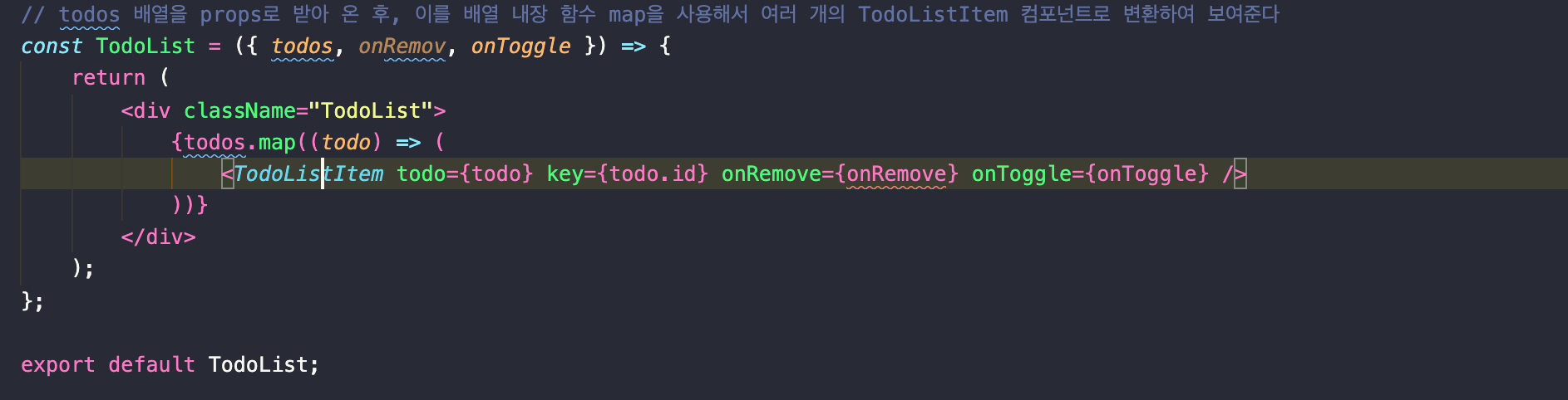 props로 받아 온 todos 배열을 배열 내장 함수 maps을 통해 TodoListItem으로 이루어진 배열로 변환하여 랜더링해 주었습니다. map을 이용하여 컴포넌트로 변환할 때는 key props를 전달해 주어야 하는데 이때 각 todo 객체의 고윳값이 id를 전달해줍니다. 그리고 TodoItem에서 다룰 데이터는 통째로 props 로 전달하면 됩니다.