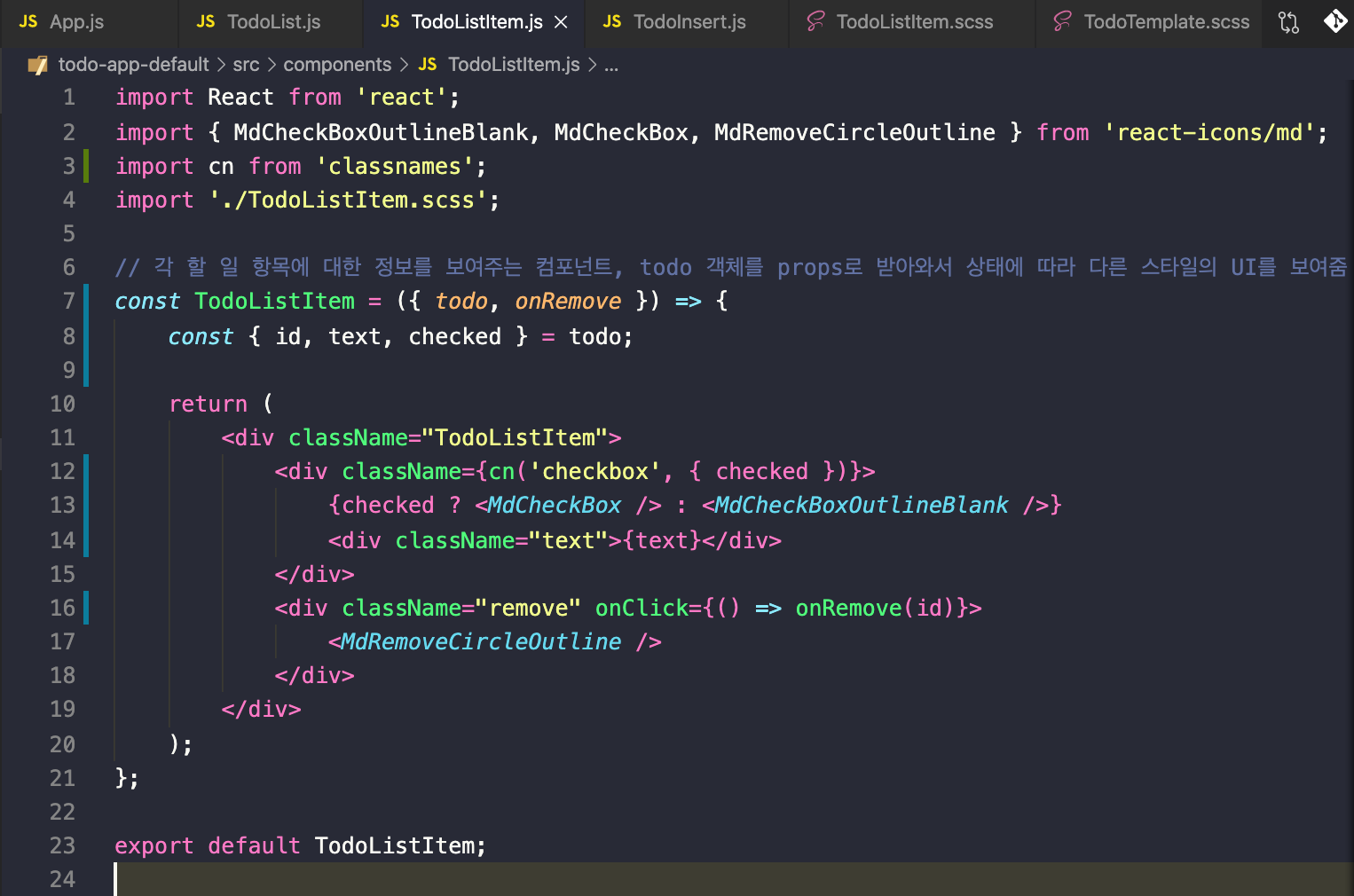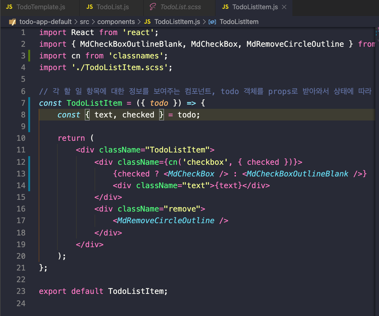 아무튼 <TodoListItem todo={todo} key={todo.id} /> 형식으로 JSX 구문이 생성되었으므로 todo 값에 따라 적절한 UI를 보여줄 수 있도록 컴포넌트를 수정해보겠습니다.