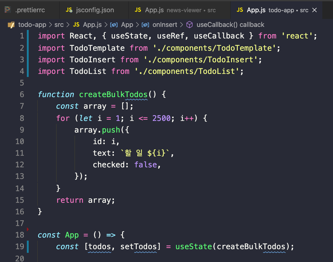 createBulkTodos() 함수를 만들어 할 일 목록을 2500개 만든 후 배열에 담아 setTodos 로 값을 설정해줍니다. 여기서 주의해서 봐야할 점은, useState(createBulkTodos())라고 작성하면 리렌더링될 때마다 createBulkTodos 함수가 호출되지만, useState(createBulkTodo)처럼 파라미터를 함수 형태로 넣어주면 컴포넌트가 처음 렌더링될 때만 createBulkTodo 함수가 실행된다는 점입니다.