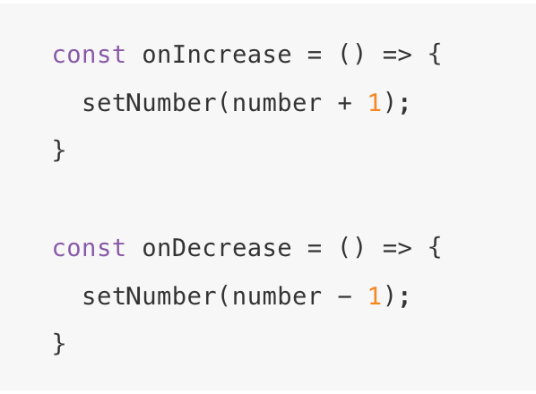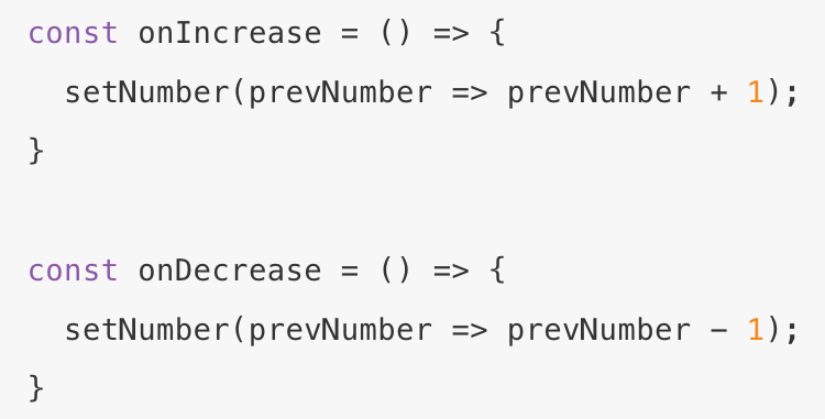 이런 함수가 있다고 해봅시다. onIncrease는 state로 정의된 number의 값을 1 증가시키고, onDecrease는 number의 값을 1 감소시킵니다. 그런데 동일한 수 많은 요소들이 이러한 함수들을 호출시키는 상황이라고 할때, useState의 함수형 업데이트를 활용하면 성능저하를 최소화 할 수 있습니다.