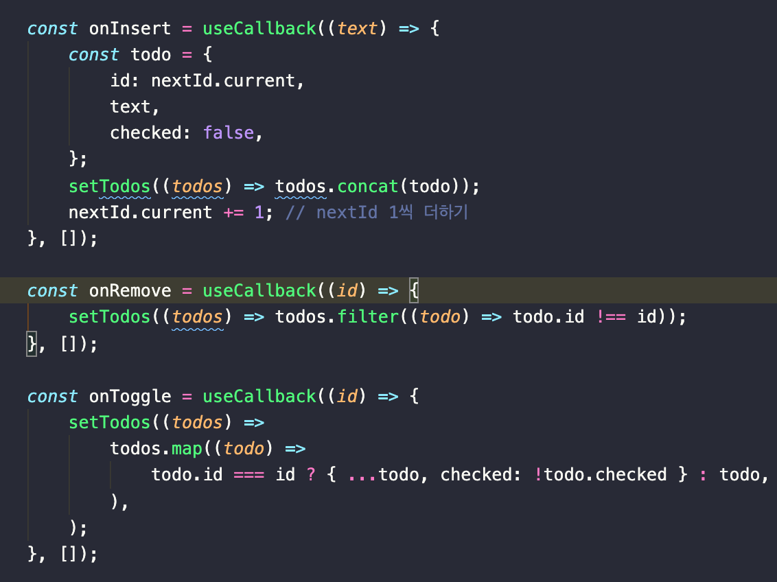 하지만 현재 프로젝트에서는 todos 배열이 업데이트되면 onRemove와 onToggle 함수도 새롭게 바뀝니다. 기존의 함수는 새로운 상태를 만들면 그것을 파라미터로 넣어서 재참조 하기때문에 새로운 항목이 추가되면 2500개의 onRemove와 onToggle 함수가 줄줄히 리렌더링 되는 참사가 발생합니다.