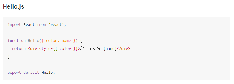 Hello 컴포넌트의 파라미터였던 props를 { color, name } 으로 대체했는데 이는 { color, name } = props 와 동일한 구문입니다.