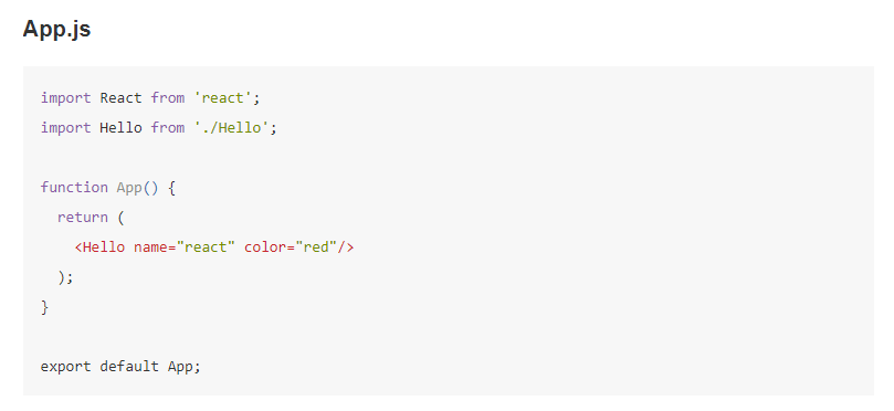 App에서 Hello 컴포넌트에게 name="react" color="red" 의 데이터(props)를 전달해주고 있습니다.